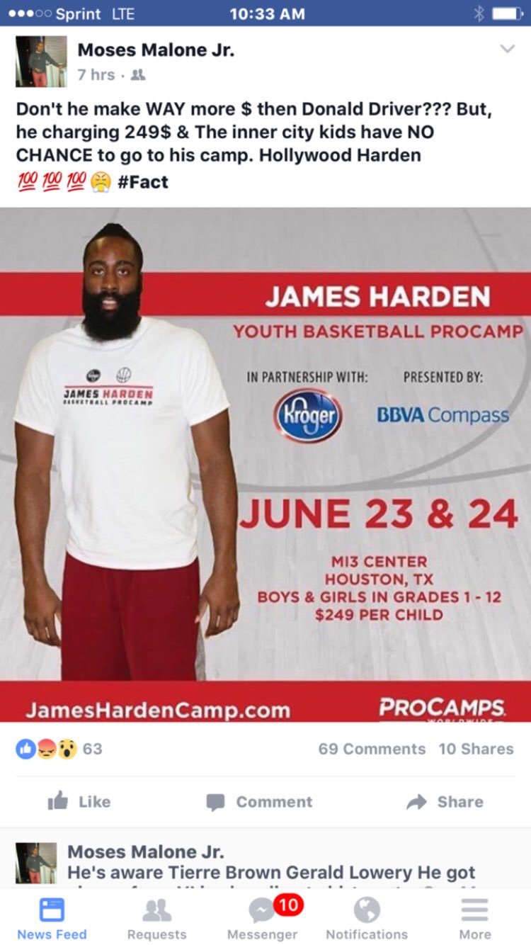 Malone Jr. claims he was attacked last June because of the criticism he posted on Facebook about Harden charging kids for his basketball camp. Four men were charged in connection with the assault, one was an employee of the club where the assault occurred.